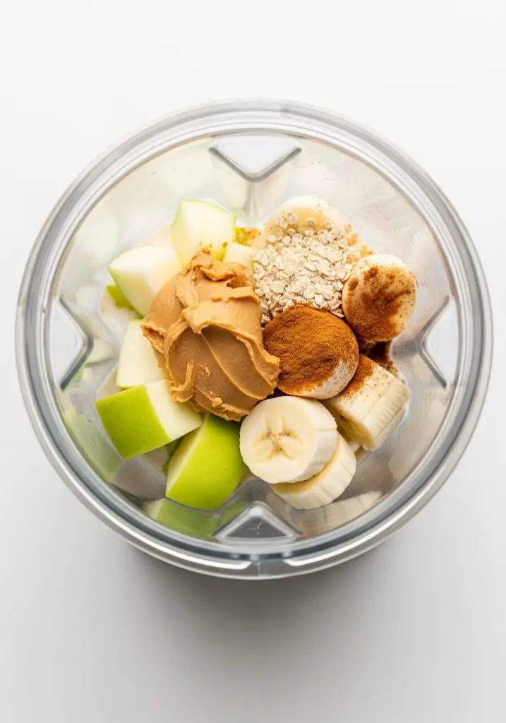 - Add Everything Else: To the blender with the apples, add the rest of the ingredients in the order they’re listed: almond milk, oats, frozen banana, peanut butter, maple syrup, vanilla, cinnamon, nutmeg, and allspice.