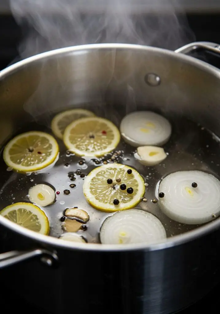 - Create the Aromatic Poaching Liquid: Fill a large pot with 8 cups of cold water. Squeeze the juice from the lemon halves into the water, then drop the squeezed lemon halves right in. Add the chopped onion, smashed garlic, Old Bay Seasoning, bay leaf, salt, and peppercorns. Bring this mixture to a simmer over medium heat and let it cook for 20 minutes to create a wonderfully flavorful broth. After 20 minutes, use a slotted spoon to scoop out and discard all the solids, then return the liquid to a simmer.