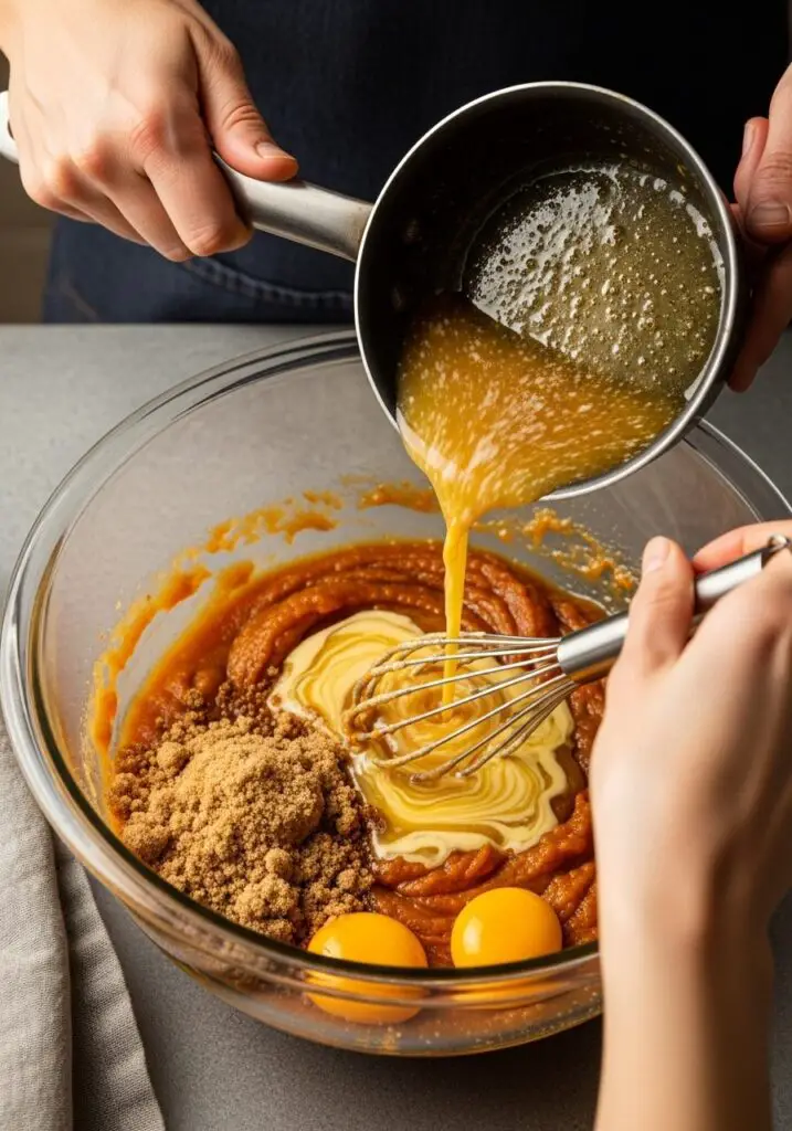 - To the brown butter, add the brown sugar, pumpkin butter, maple syrup, eggs, and vanilla. Mix well.
