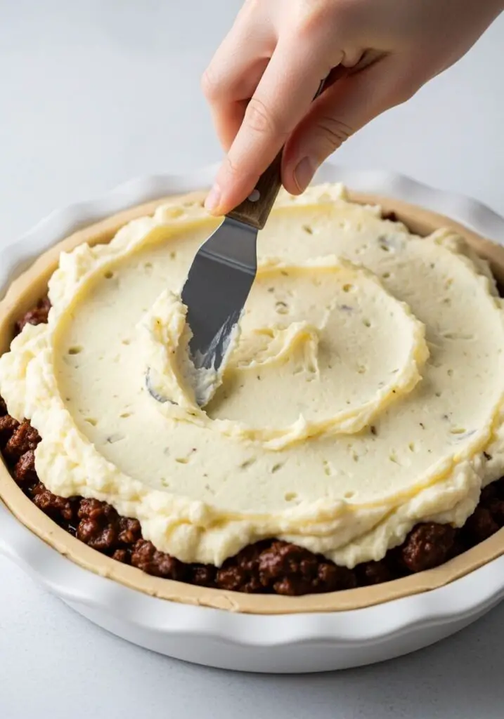 - Top and Bake: Spoon the cheesy mashed potato mixture over the beef filling and gently spread it to the edges to seal it in. Sprinkle the remaining 1/4 cup of cheddar cheese over the top. Place your pie plate on a foil-lined baking sheet (this is my secret to no messy oven spills!).