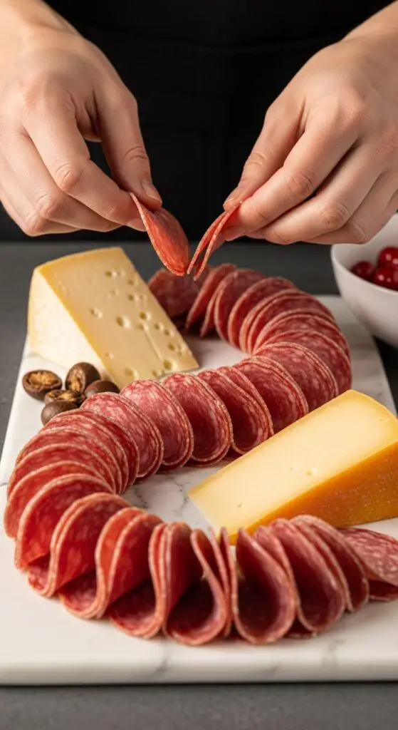 - Salami: Calabrese or Genoa salami, folded into “roses” or fanned out.
