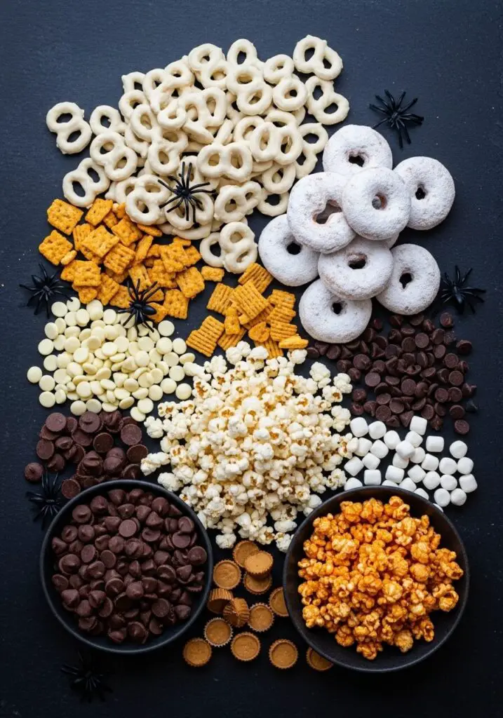 - Add Some Orange: Mix in some Reese’s Pieces, cheese puffs, or candy pumpkins to add a pop of classic Halloween orange.