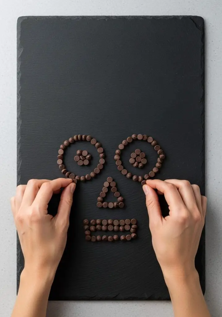 - On a large, dark-colored tray or serving board, arrange dark chocolate chips to form two circles for eyes and a small triangle for a nose.