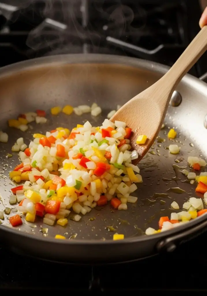 - Sauté the Veggies: In a large skillet, heat half of your olive oil over medium heat. Add the diced onion and bell pepper. Sauté, stirring occasionally, for about 5-7 minutes until the onions are soft and translucent. Season with a little salt and pepper.