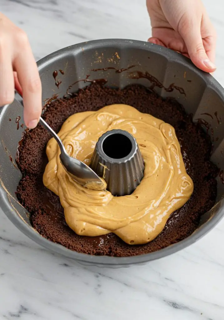 3. Layer and Bake: Pour half of the chocolate cake batter into your prepared Bundt pan. Carefully spoon the peanut butter filling in a ring over the center of the batter, making sure the filling does not touch the sides of the pan. Pour the remaining batter evenly over the filling. Gently tap the pan on the counter to remove any air bubbles. Bake for 50 to 55 minutes, or until a wooden pick inserted near the center comes out clean.