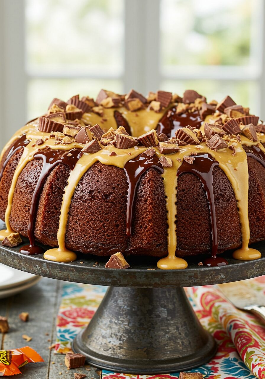Imagine a deep, dark, ultra-moist chocolate Bundt cake. Now, imagine cutting into it to reveal a surprise, hidden river of creamy peanut butter cheesecake filling. As if that weren’t enough, the entire masterpiece is draped in not one, but two luscious glazes—a sweet peanut butter glaze and a rich, glossy chocolate glaze—and studded with chopped Reese’s Peanut Butter Cups. This is the cake that will make jaws drop and have everyone begging you for the recipe.