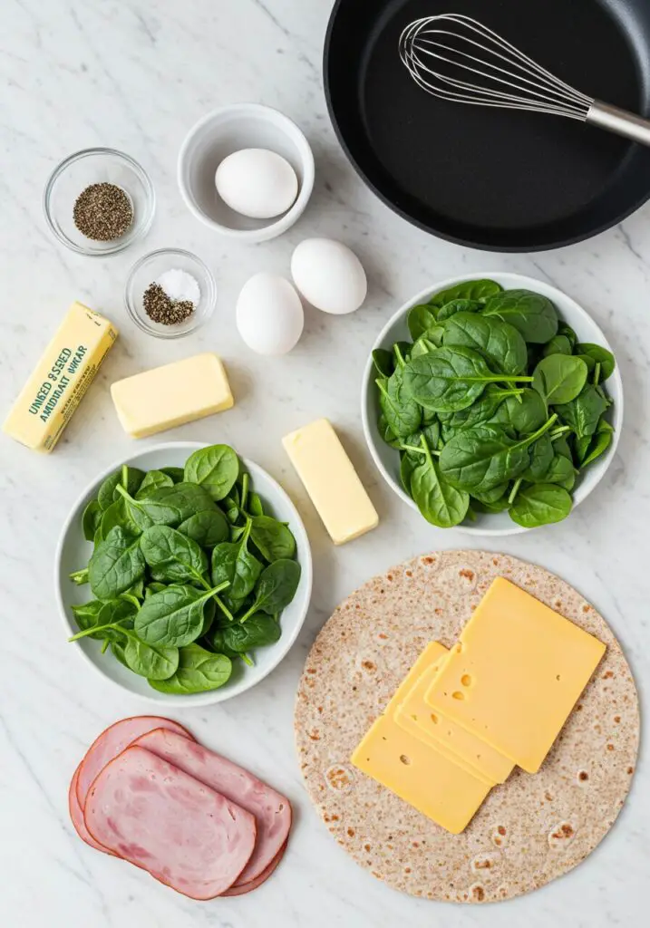 - Flip & Add Fillings: Slide a large rubber or silicone spatula under the tortilla and the cooked egg, and with one confident, single motion, flip the entire tortilla-egg over! Now, quickly scatter the 1/3 cup of baby spinach on the half of the tortilla that’s closest to you in the pan. Top the spinach with 2 slices of American cheese, and finally, arrange your 2 thin slices of deli Black Forest ham over the cheese.