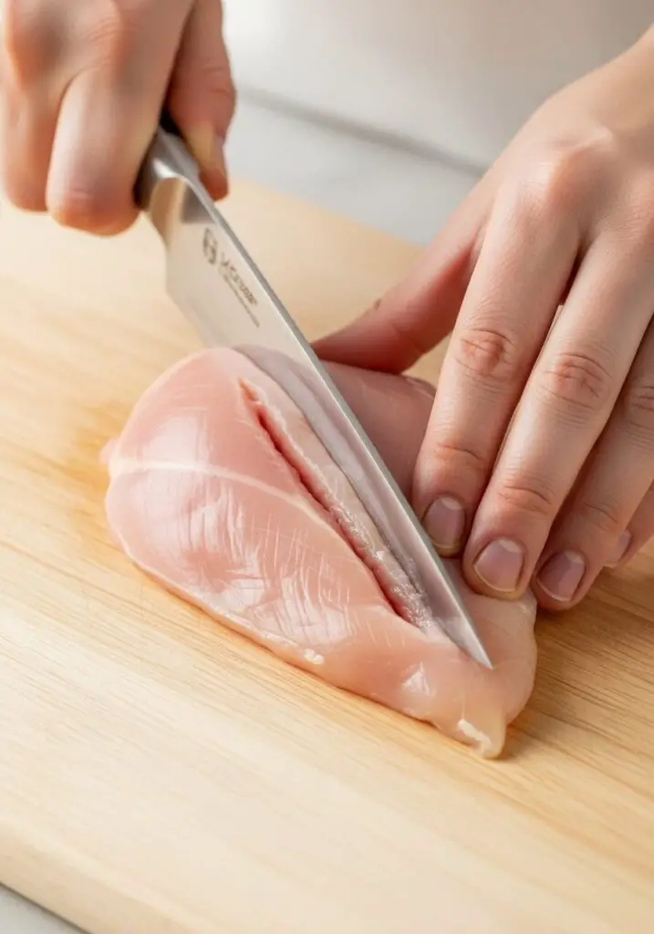 - Prep the Chicken: Lay a chicken breast flat on your cutting board. Carefully hold your knife parallel to the board and slice a deep pocket into the thickest side of the breast, stopping about 3/4 of the way through. Don’t cut it all the way in half! Cover the chicken with plastic wrap and use a meat mallet to gently pound it to an even thickness.
