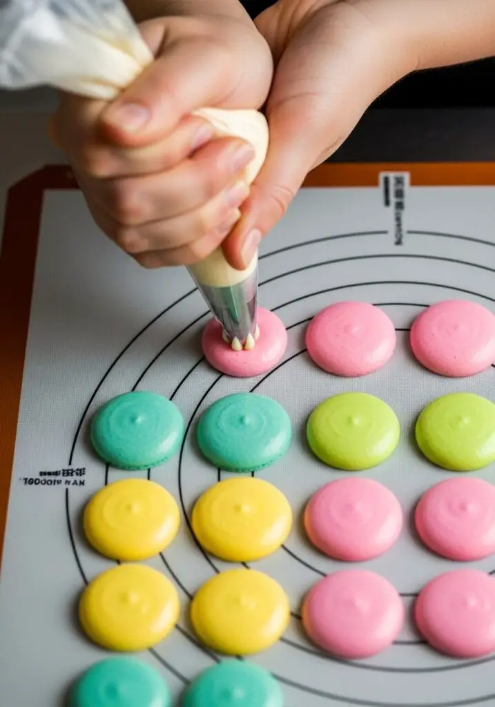 - Pipe the Shells: Transfer the batter to a piping bag with a round pastry tip. On baking sheets lined with silicone macaron mats or parchment paper, pipe small, uniform circles.