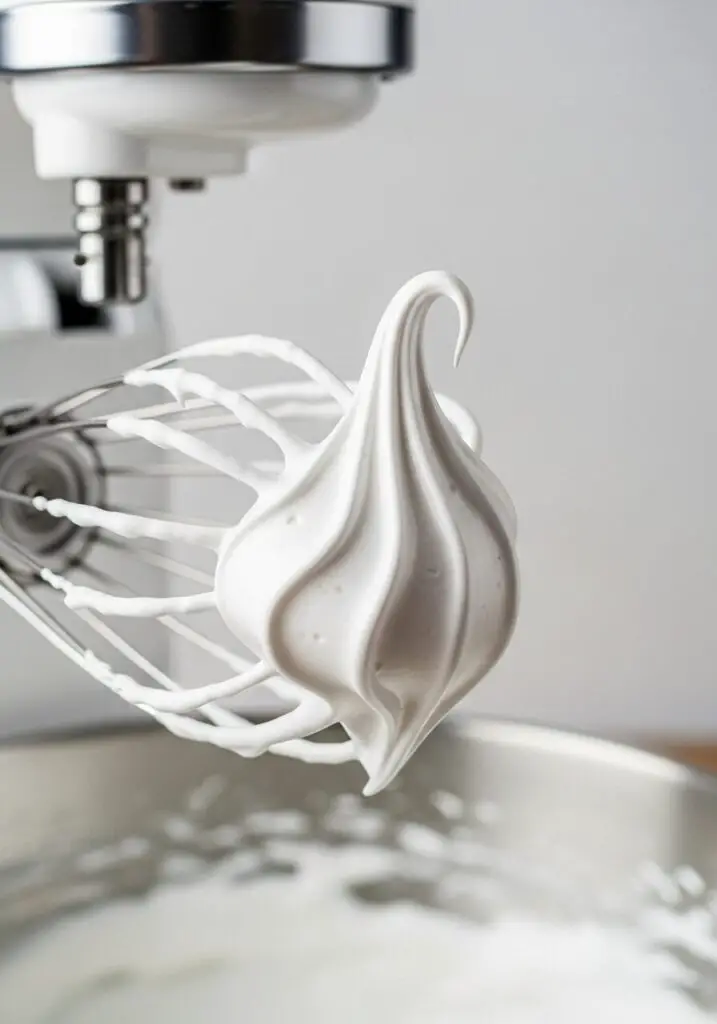 - Build the Meringue: With the mixer still running, gradually add the superfine sugar, one spoonful at a time. Once all the sugar is in, increase the speed to medium-high and continue to beat until stiff peaks form. The meringue should be thick and glossy. When you lift the whisk, the peak should hold its shape but have a very slight curl at the very tip, like a little bird’s beak. Be careful not to overbeat!