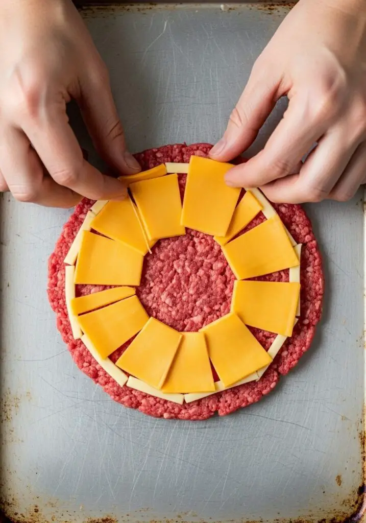 - Stuff with Cheese: On 6 of the patties, fan 6 quarters of American cheese (1.5 slices total) in a circle, making sure to leave a clean ½-inch border all the way around.