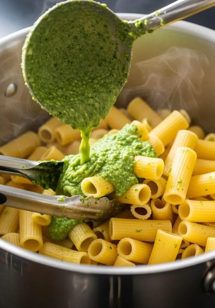 - Drain and Toss. Drain the pasta and immediately return it to the hot stockpot. Pour the broccoli pesto over the top and use tongs to toss everything together until every piece of pasta is coated in the vibrant green sauce.