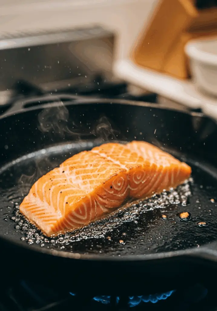 - Sear the Salmon (Flesh-Side First!): Once your skillet is hot enough that a drop of water sizzles instantly, carefully place the salmon fillet into the pan skin-side up. Let it cook for 3 minutes, completely undisturbed. This creates a beautiful crust on the flesh.