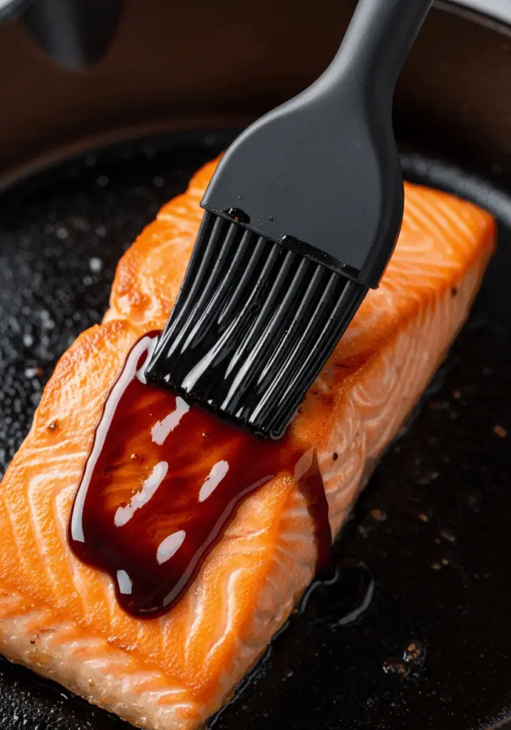 - Flip and Glaze: Using a flexible fish spatula, carefully flip the salmon so it is now skin-side down. Immediately brush or spoon the remaining glaze from the saucepan all over the top of the fillet.