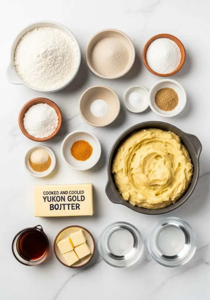 - 1 ¼ cup cooked, cooled, mashed Yukon gold potatoes → The secret weapon! This creates an incredibly moist and tender crumb.