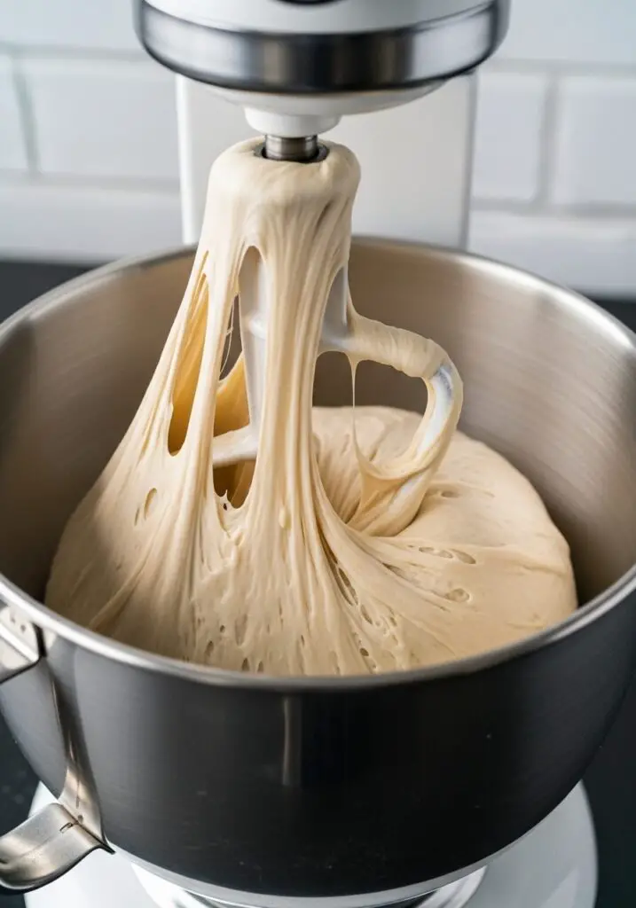 - Combine and Knead: Add the flour mixture to the wet ingredients in three parts, mixing on low. After the second addition, switch to the dough hook. Add the final part of the flour and let the mixer knead the dough for a full 15-20 minutes. The dough is ready when it’s smooth, elastic, and pulls away from the sides of the bowl. It will be slightly sticky to the touch, but shouldn’t stick to your hands. Add a splash more water or a sprinkle of flour if needed to get the right consistency.