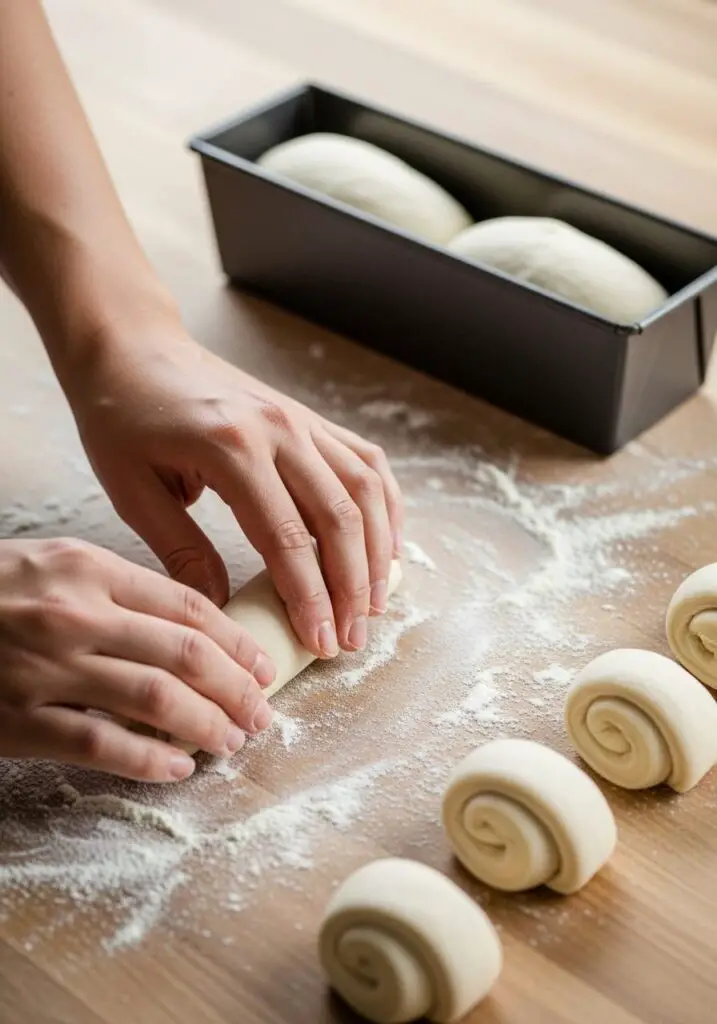 - Shape the Loaves: Punch the dough down again. Now, choose your shaping method! You can divide the dough into 6 equal pieces and form three small logs for each loaf pan, or divide it into 12 pieces and form six small balls for each pan, arranged in two rows.