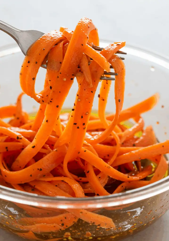 - Marinate: Place the carrot ribbons directly into the dish with the marinade and toss gently to coat every piece. Let them marinate in the refrigerator for at least 15-30 minutes for the flavors to meld.