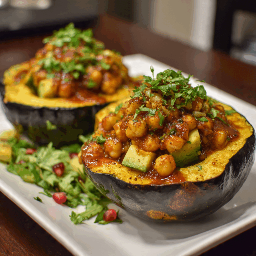 - Stuff the Squash: Divide the curried chickpea mixture evenly between the two hollowed-out squash halves, mounding it generously.