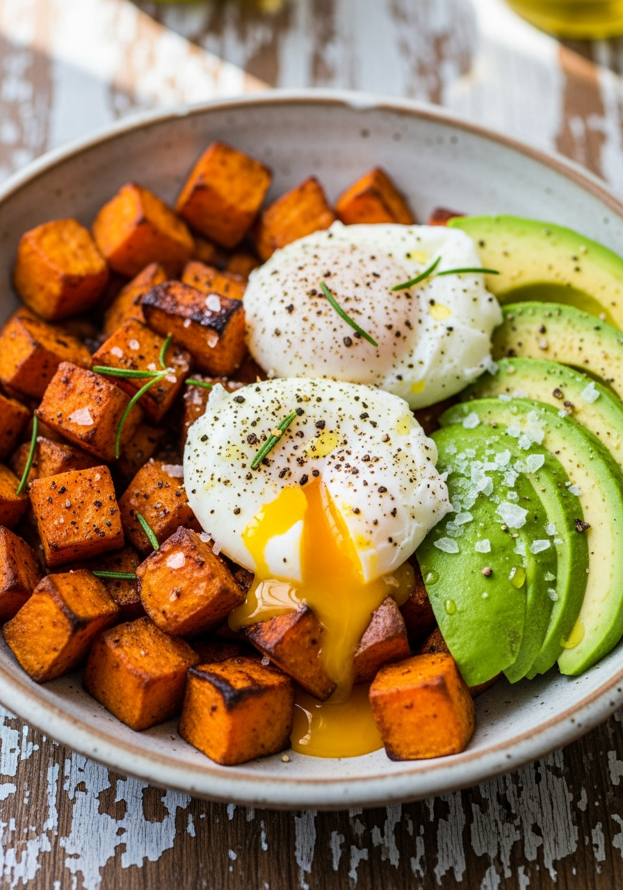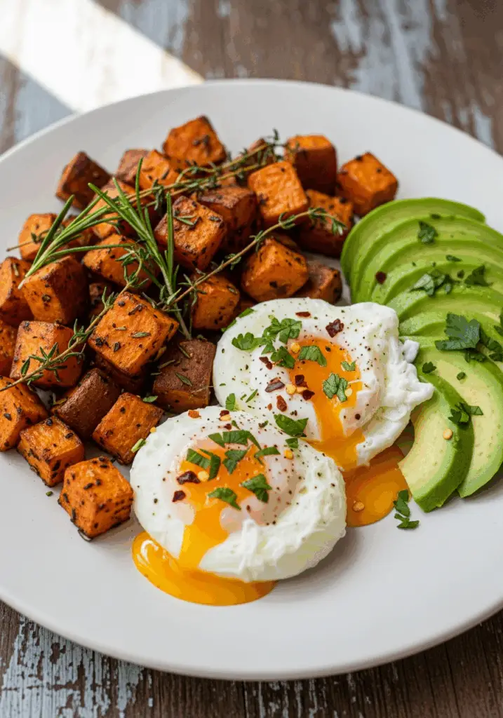 - Assemble Your Plate: Arrange a generous portion of the hot roasted sweet potatoes, the freshly poached eggs, and the sliced avocado on your serving plate. Serve immediately and enjoy!