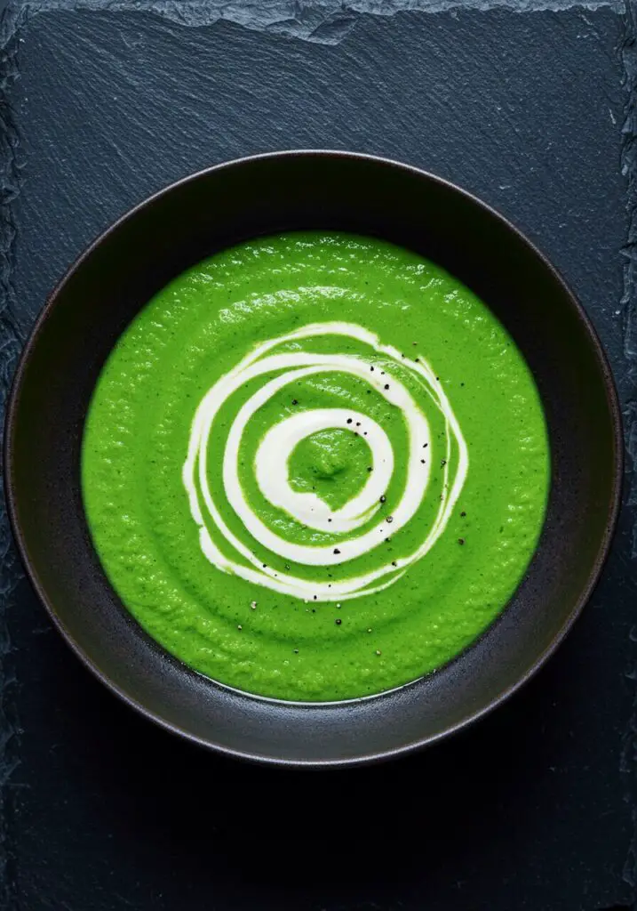 4. Serve and Enjoy: Ladle the hot, vibrant green soup into bowls. Top with an extra swirl of crème fraîche and serve immediately with slices of hot buttered toast for dipping.