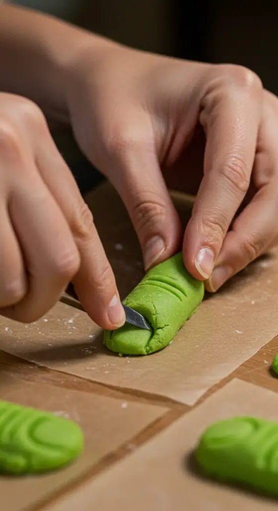 - Add the Creepy Details: Arrange the logs on your prepared baking sheet. To create the nail bed, press a sliced almond firmly into the tip of each finger. To create the knuckle, gently pinch the dough just below the almond and again about halfway down the log. Use the tip of a sharp knife to carefully carve a few horizontal lines of varying lengths into the knuckle to create realistic creases. For extra flair, press one or two small pieces of pistachio into the finger to create spooky “warts.”