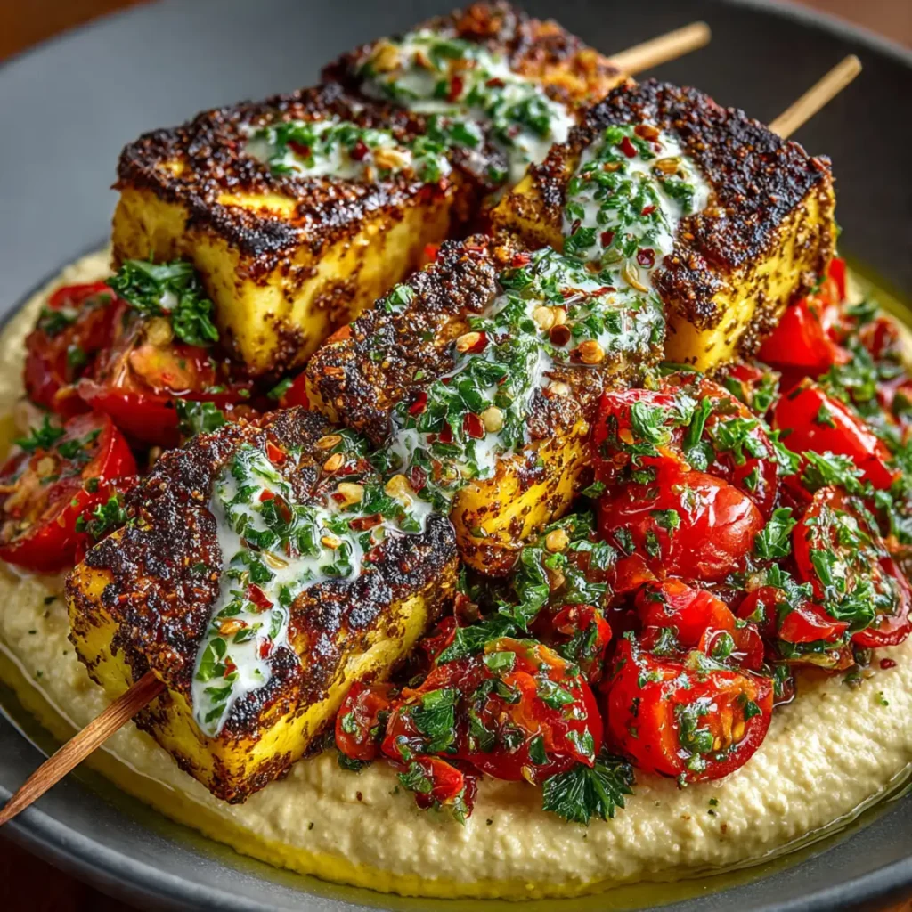 Grilled Za’atar Tofu Skewers with Tomato Salad and Hummus