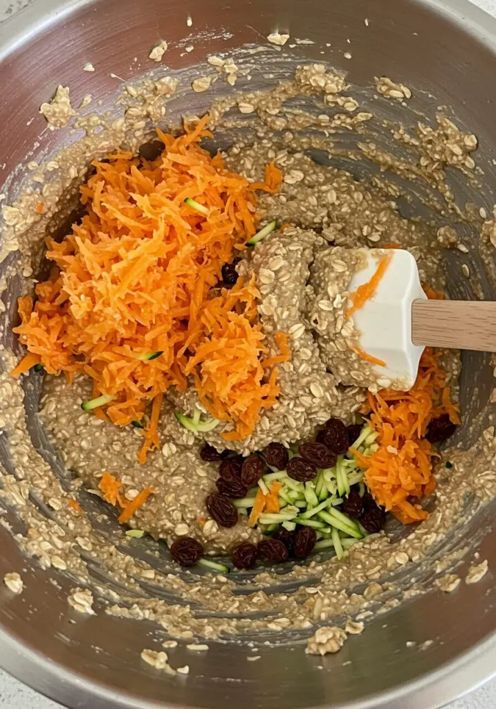 - To the oat flour, add the remaining ½ cup oats, walnuts, raisins, cinnamon, baking powder, and salt. Squeeze excess water from the grated zucchini, then add it and the grated carrot to the bowl. Add the mashed banana, applesauce, maple syrup, vanilla, and thickened flax eggs. Stir everything until just combined.